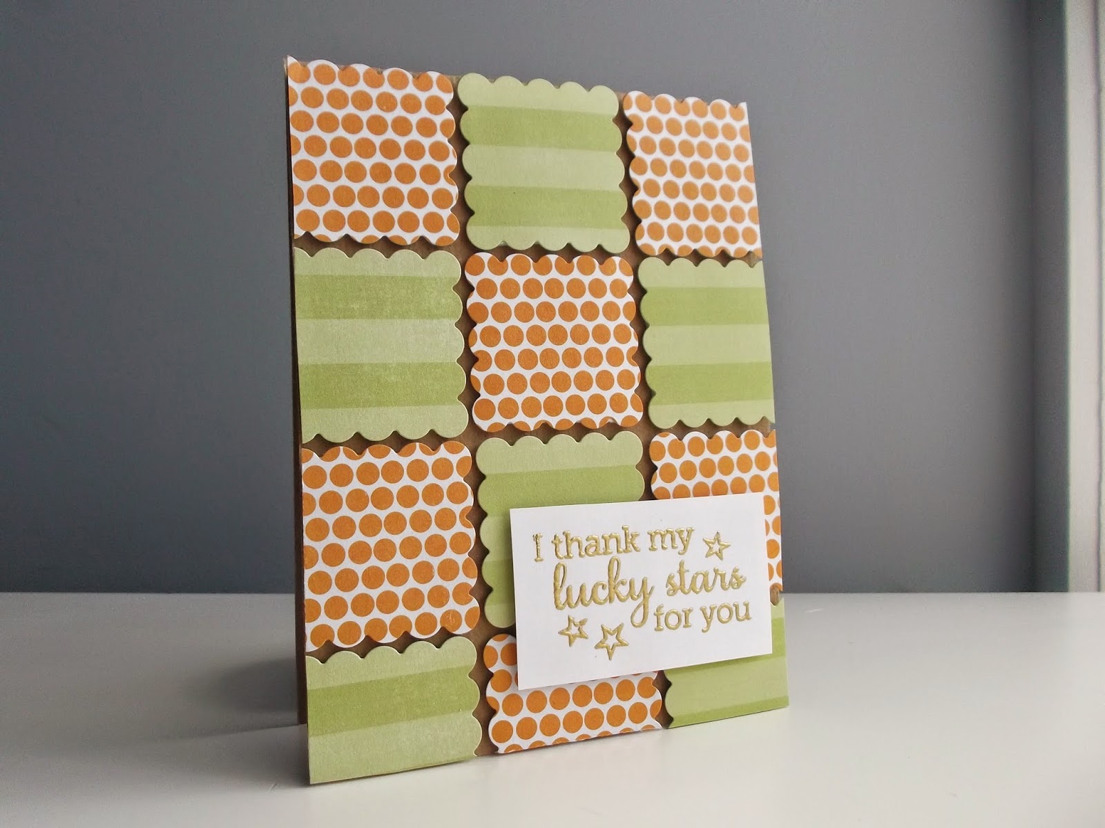It was pretty simple to make. I die-cut lots of squares from both papers and arranged them over the card front, trimming back any over the edges. The squares were then all popped up on foam tape while trying to keep them in line and have the same spacing. I wanted to keep the sentiment simple, so cut a piece of white CS and heat embossed the sentiment in gold. No sequins or enamel dots needed.