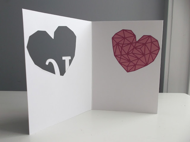 Using dark and light pink paint chips, I die-cut the heart from both, inlaid the dark pink frame into the inside of the card and then all the light pink pieces. This means that the inside of the card remains one-layer.